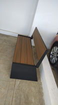 Banca con respaldo fabricada en hierro con inserto de madera. Diferente tipos de tono en madera WPC y color. La pintura es de Linner poliuretano. No incluye instalación